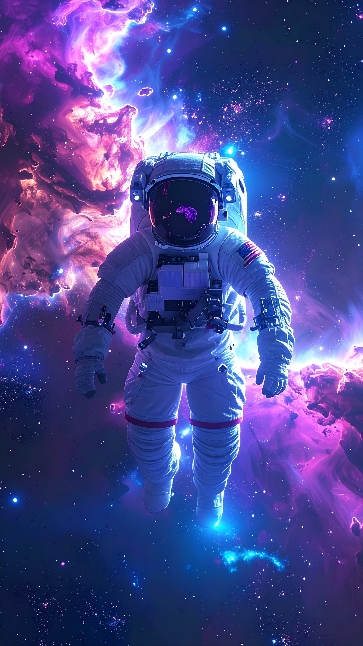 Astronaut Floating in Deep Space Surrounded by Colorful Nebula and Stars